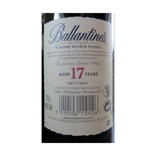 - Được sản xuất lần đầu tiên vào năm 1930 , rượu Ballantines 17 Years Old là Nhãn hiệu rượu Whisky uy tín còn lại không hề thay đổi từ hơn 85 năm qua . Công thức pha trộn của Ballantines 17 năm luôn được Gia đình nhà Ông George Ballantines cất giữ cẩn thận và truyền lại cho các chuyên gia pha trộn rượu kế nghiệp ( Master Blender )